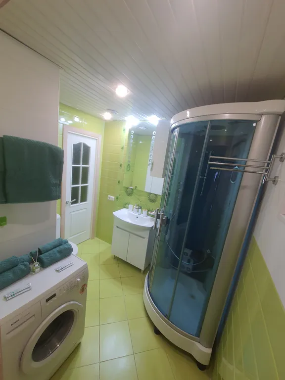 Санузел: душевая кабинка, стиральная машина, 3 комплекта полотенец;