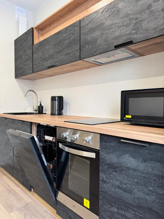 Кухня укомплектована всей необходимой посудой и приборами. Новая техника: чайник, холодильник, микроволновая печь, электрическая плита, посудомоечная машина. Приветственный набор продуктов: чай, кофе, сахар, соль, перец, растительное масло, крупы.