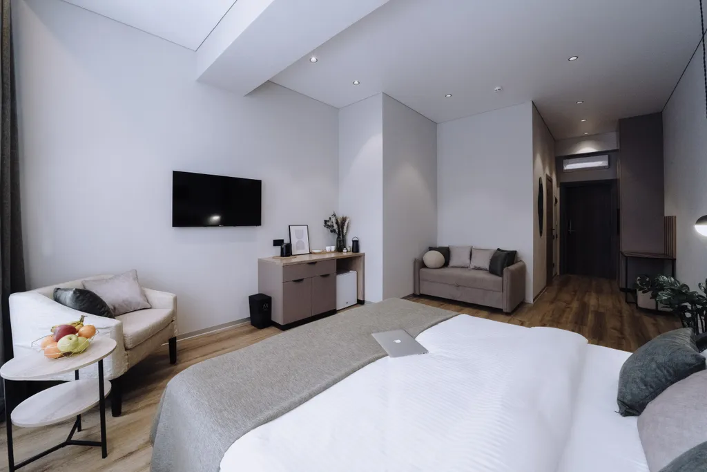 В центре номера расположена большая кровать, обеспечивающая максимальный комфорт для отдыха. Дополнительно имеется раскладывающийся диван, который предоставляет возможность разместить ещё одного или двух гостей.