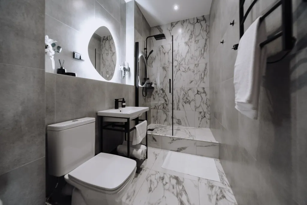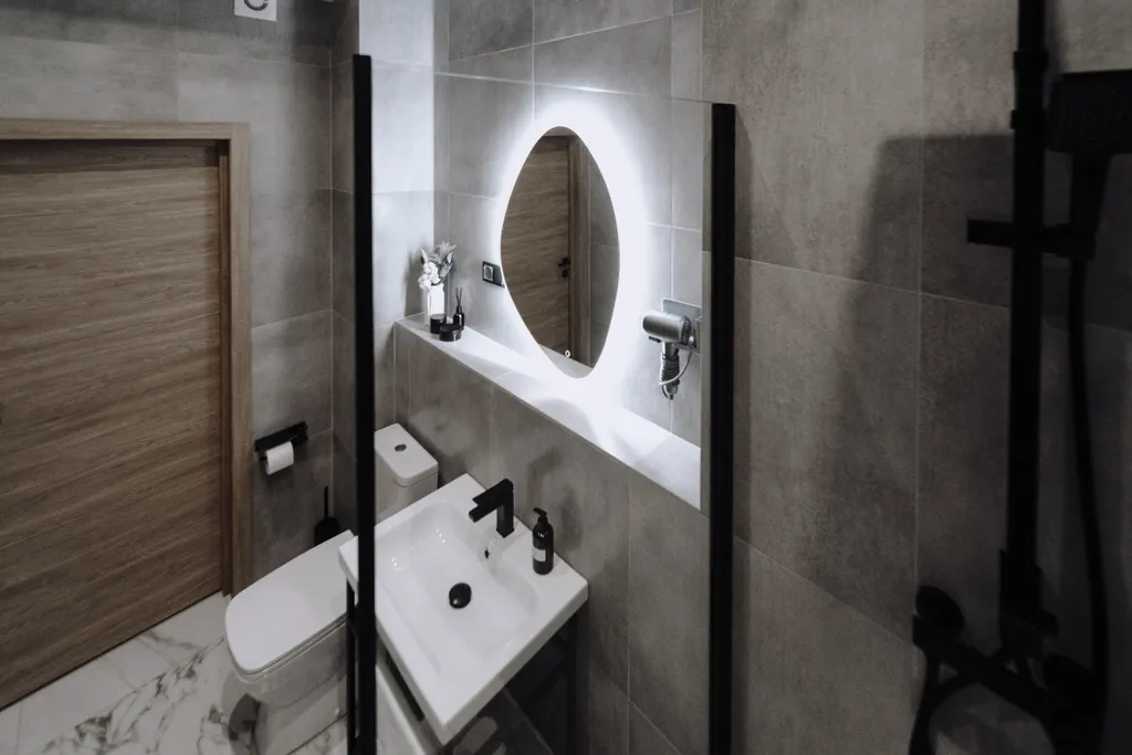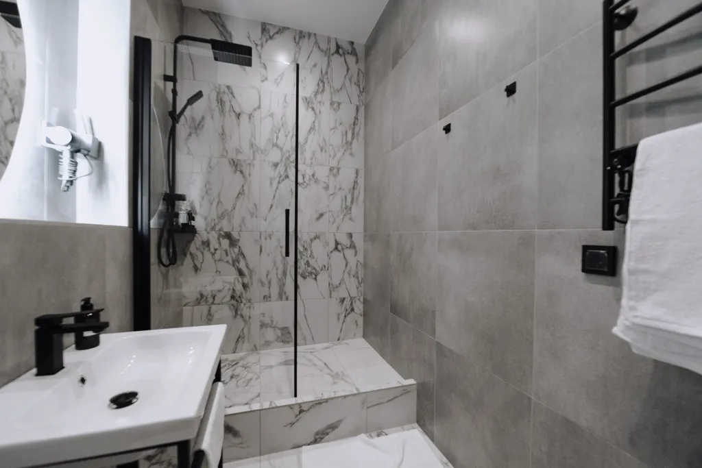 Просторная ванная комната, оборудованная душевой кабиной, халатами, тапочками и набором косметики для вашего комфорта.